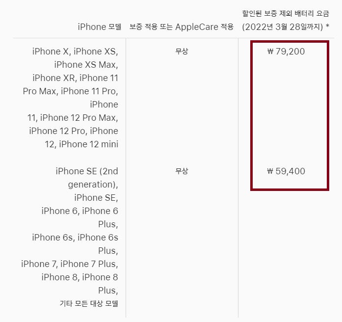 아이폰 배터리는 공식 애플스토어를 통해서 교체가 가능합니다. 현재 배터리 교체 비용 할인 행사(~2022년 3월 28일)가 진행 중으로 아이폰 10, 11, 12 Pro Max 제품은 79,200원, 아이폰 SE, 6, 7, 8 Plus 제품은 59,400원에 교환을 받을 수 있습니다.