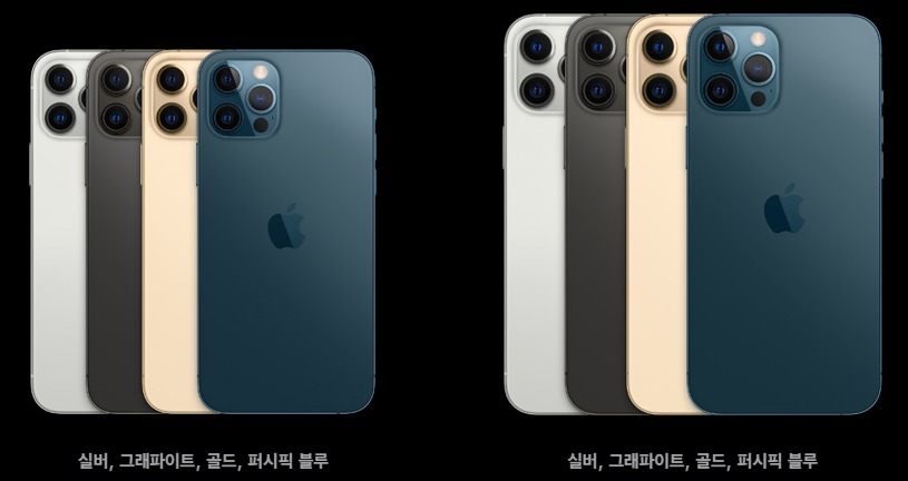 아이폰 12 프로와 아이폰 12프로 맥스는 '골드, 그래파이트, 퍼시픽블루, 실버' 4가지 색상 중 하나를 선택할 수 있습니다.