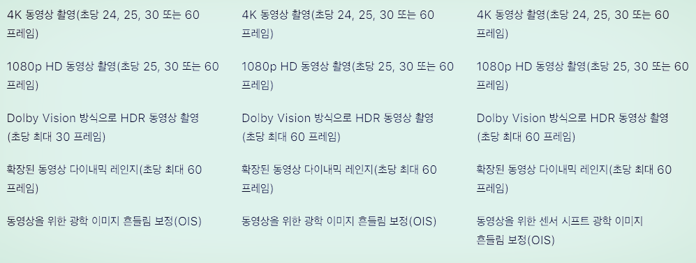 카메라 촬영에서 사진만큼이나 동영상도 중요합니다. 3개 모델의 동영상 촬영에는 큰 차이가 없습니다.