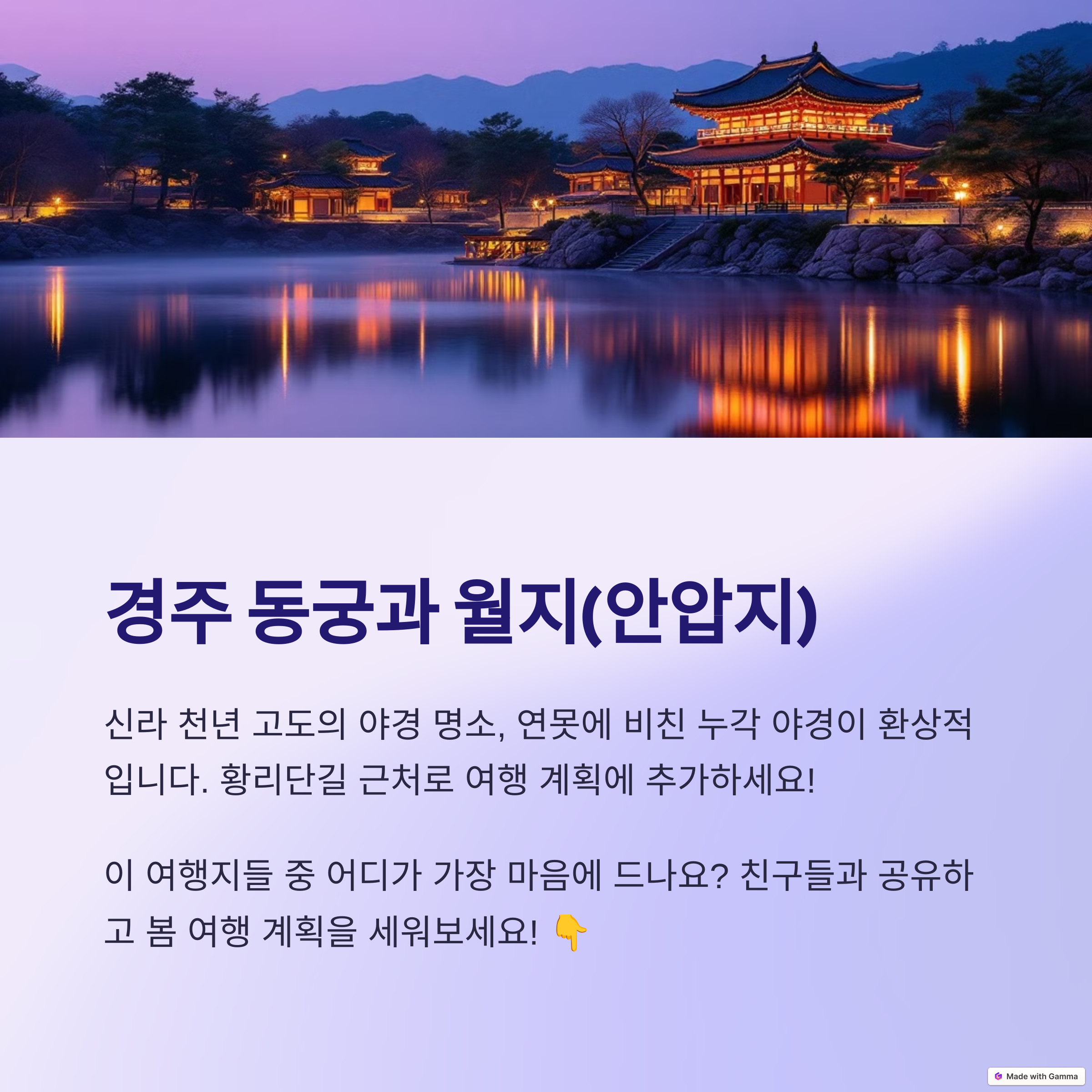 봄밤을 더욱 아름답게 즐길 수 있는 여행지는 어디일까요? 바로 경주입니다! 특히 동궁과 월지는 황금빛으로 반짝이는 반영이 환상적이라, SNS에서도 야경 명소로 큰 인기를 끌고 있어요. 밤이 되면 조명이 켜지며 고즈넉한 분위기가 극대화되어, 로맨틱한 데이트나 감성적인 여행을 즐기기에 딱입니다.