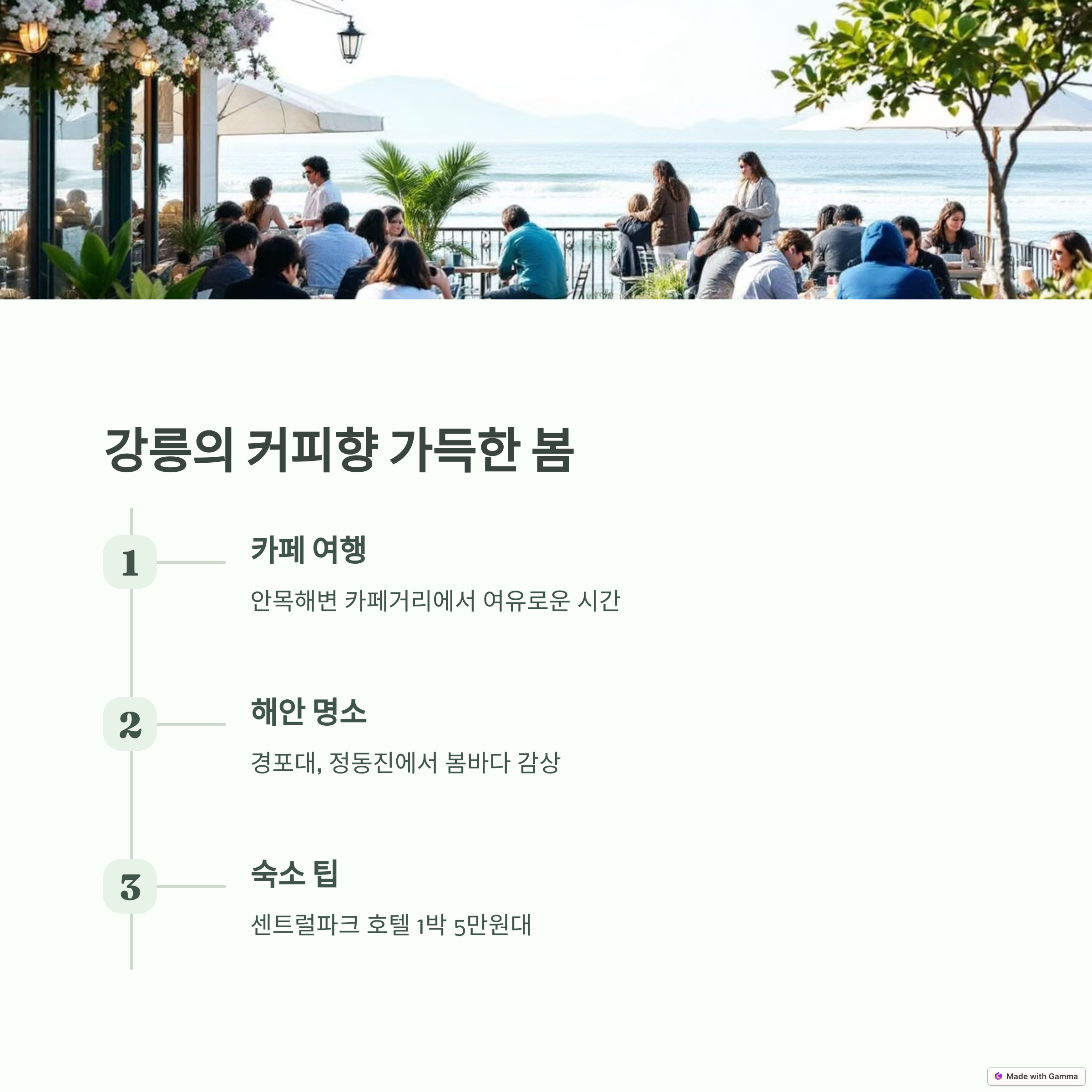 강릉은 3월의 따뜻한 바닷바람을 맞으며 여유롭게 여행하기 좋은 곳이에요. 안목해변 커피거리에서 바다를 바라보며 커피 한 잔의 여유를 즐기고, 경포대에서는 벚꽃과 함께 산책을 즐길 수 있습니다. 또한, 중앙시장에서는 강릉 특산물과 맛있는 길거리 음식을 저렴하게 맛볼 수 있어요.
