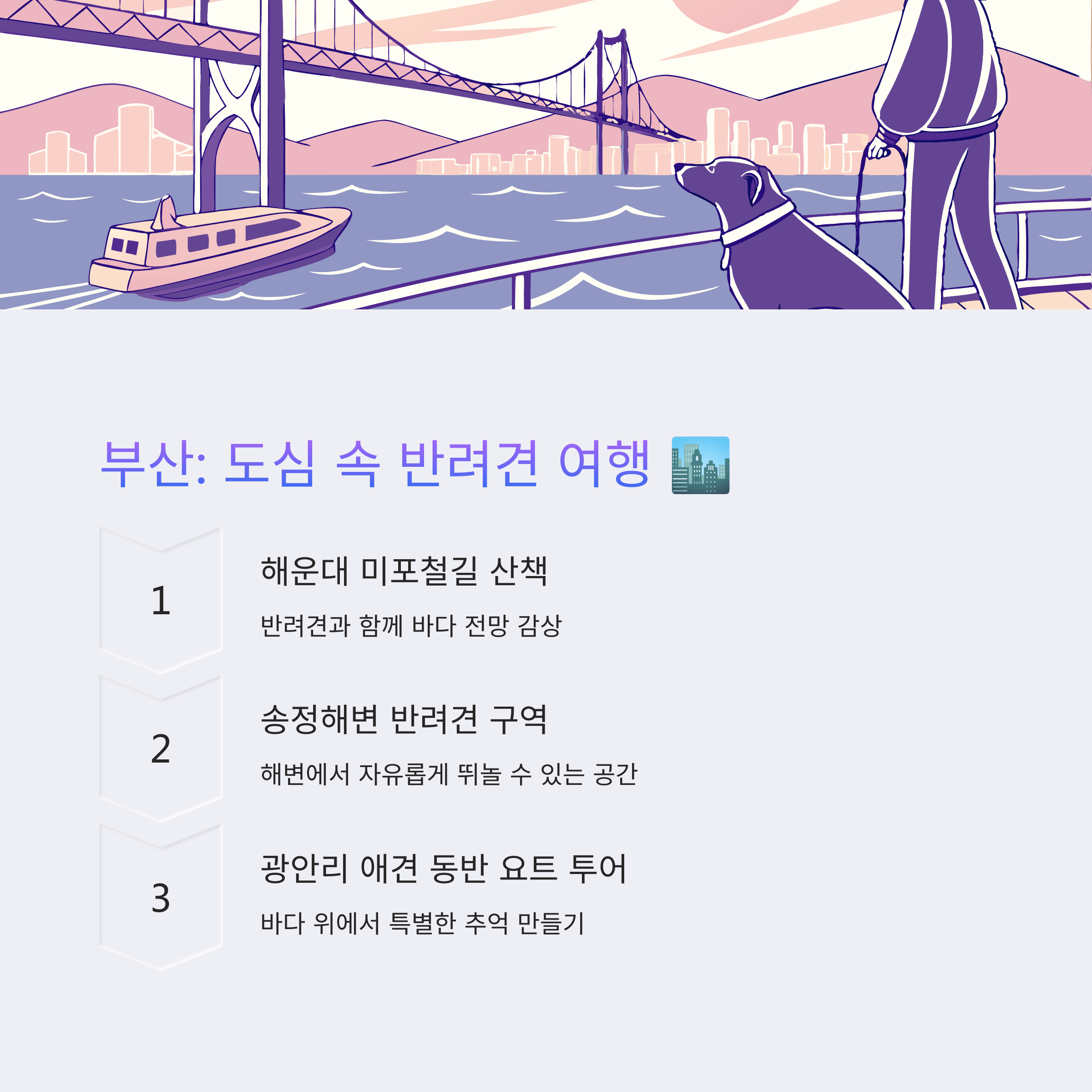 부산은 반려견과 함께 바다를 즐기기에 좋은 여행지예요. 해운대, 광안리뿐만 아니라 반려견과 함께 입장할 수 있는 애견 해변과 애견 동반 카페가 많아 더욱 편리합니다.