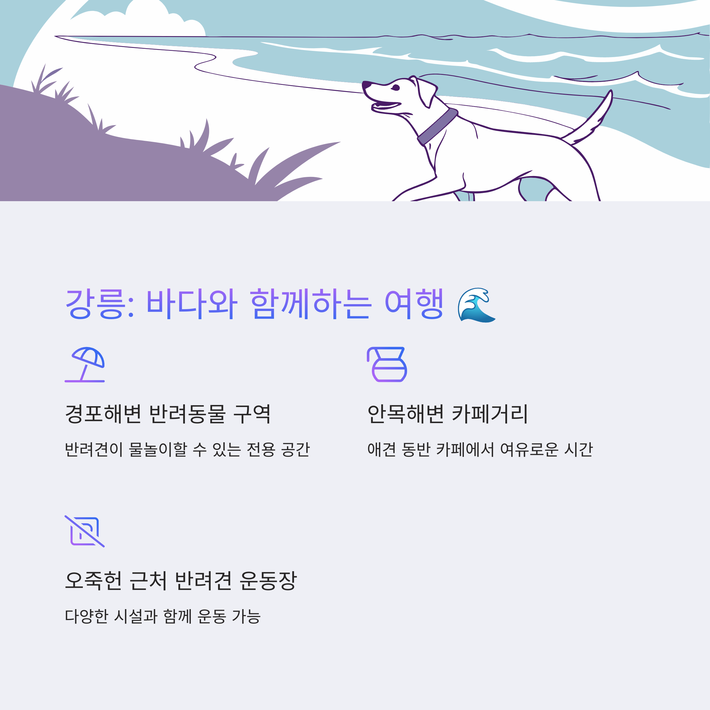 강릉은 반려견과 함께 바다를 즐기기에 완벽한 여행지예요. 반려견과 함께 입장할 수 있는 해변과 애견 동반 숙소, 카페가 많아 부담 없이 여행할 수 있습니다.
