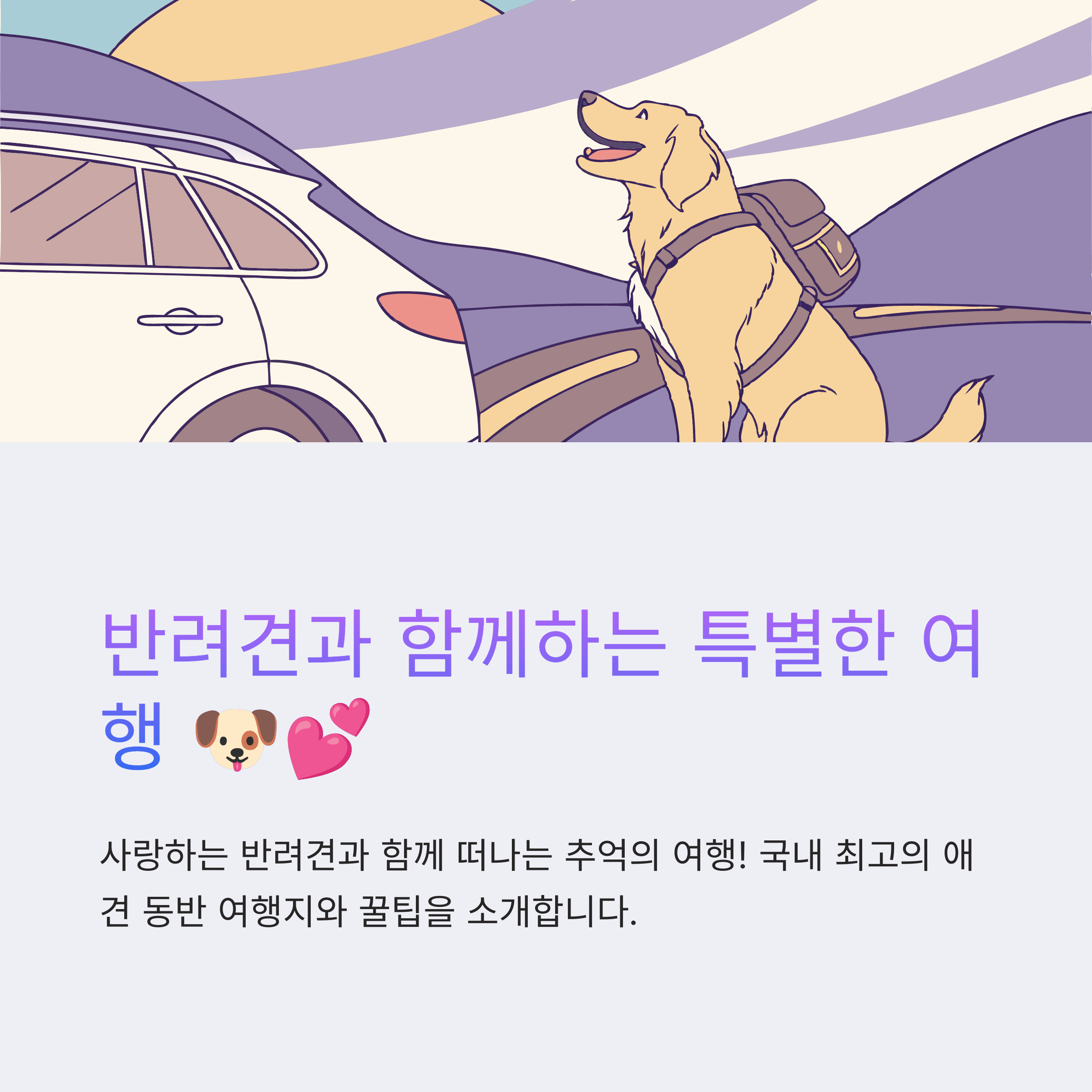 소중한 반려견과 함께 떠나는 여행! 🐶💕 반려동물과 함께할 수 있는 최고의 여행지를 소개합니다. 아름다운 자연 속에서 강아지와 마음껏 뛰놀고, 함께 특별한 추억을 만들어보세요. 🌿🚗