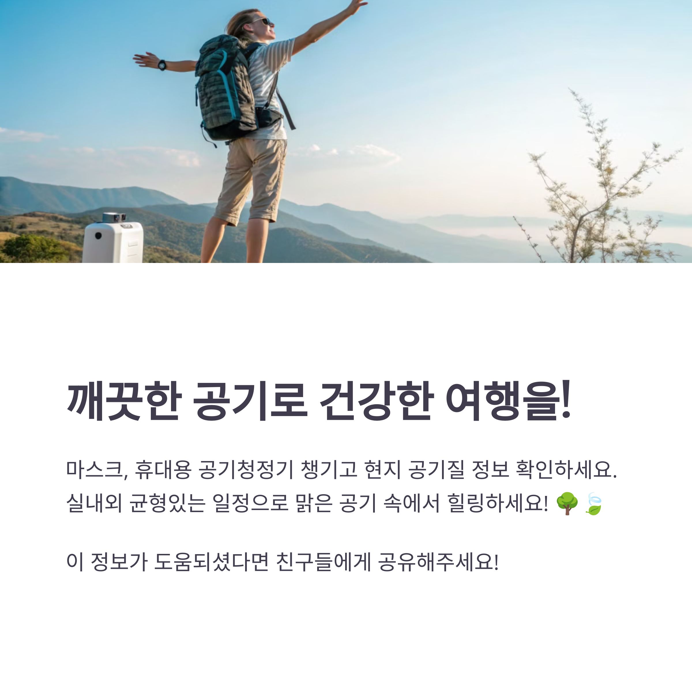 미세먼지 시즌에도 맑은 공기를 마시며 힐링할 수 있는 방법은 많아요! 실내 공기 관리법을 활용하고, 깨끗한 자연을 품은 제주도, 강원도 태백, 남해, 지리산 등으로 떠나보세요. 맑은 공기와 함께하는 여행이 주는 힐링을 직접 경험해 보시길 바랍니다. 여러분이 추천하는 공기 좋은 여행지는 어디인가요? 댓글로 함께 이야기 나눠요! 😊🌿🏕️
