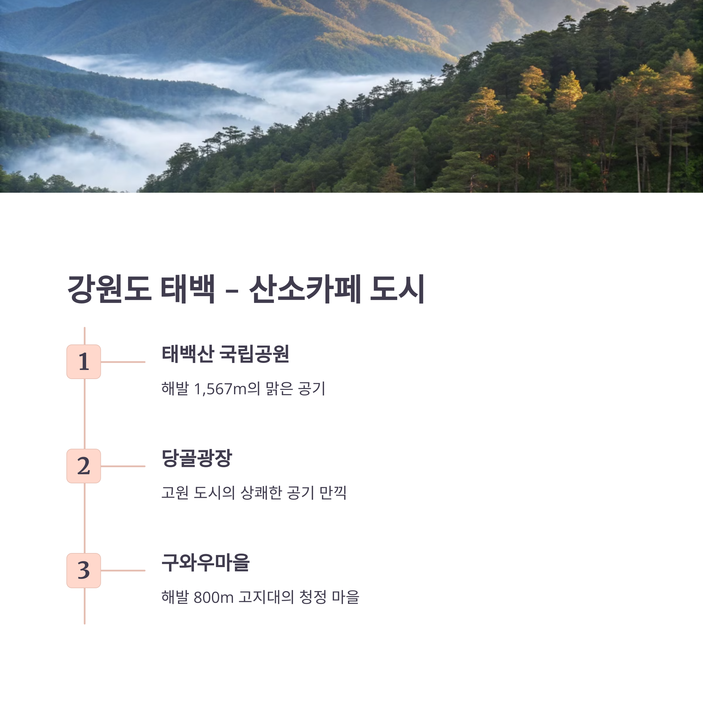 강원도 태백은 해발이 높은 지역이라 미세먼지가 적고, 청정한 자연환경을 유지하고 있어요. 용연동굴과 태백산 국립공원을 방문하면 깨끗한 공기를 마음껏 마실 수 있답니다.