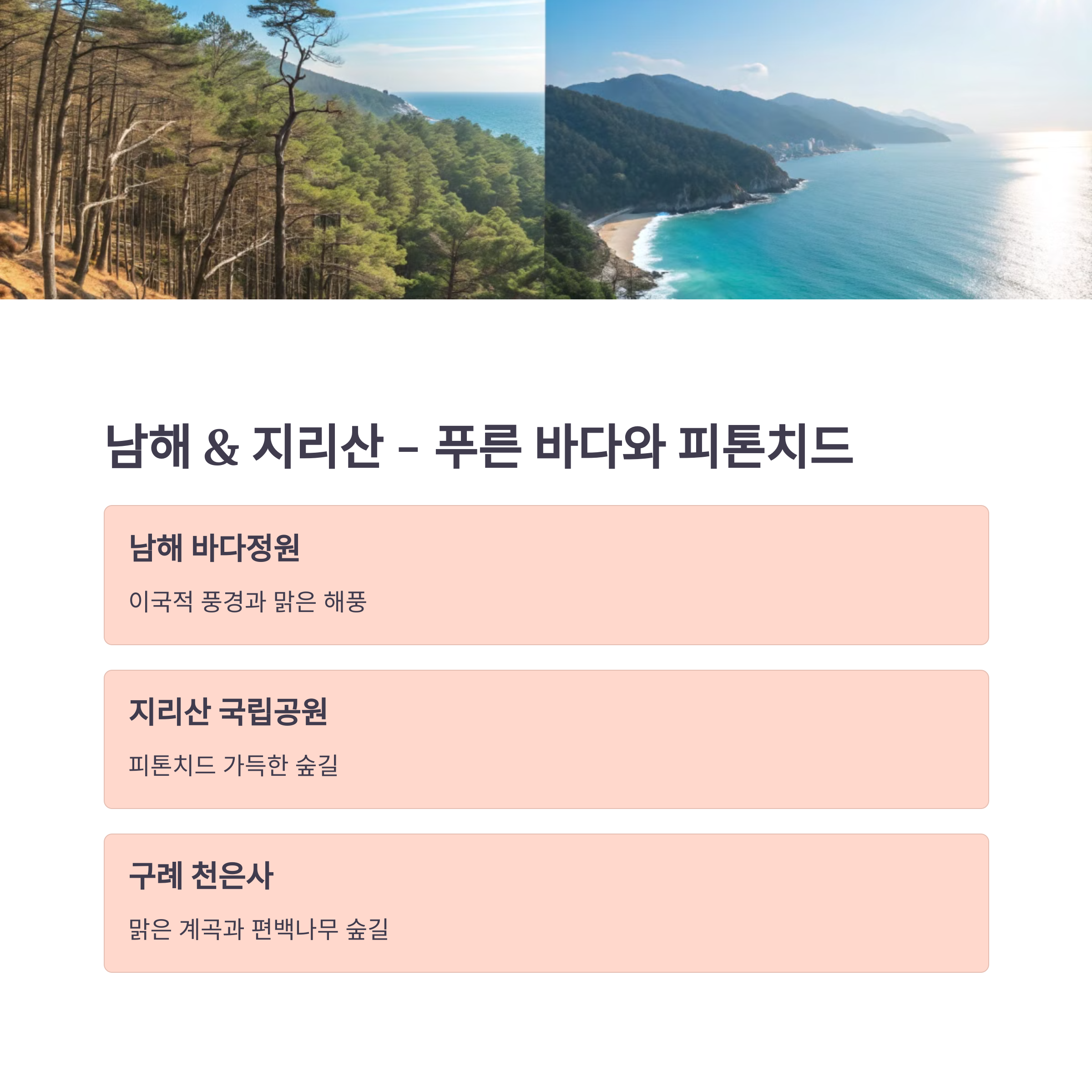 남해는 깨끗한 해풍 덕분에 미세먼지가 적고, 여유로운 분위기 속에서 힐링할 수 있는 최고의 여행지예요. 특히 상주은모래비치와 독일마을은 맑은 공기 속에서 아름다운 경관을 감상하기에 좋답니다.