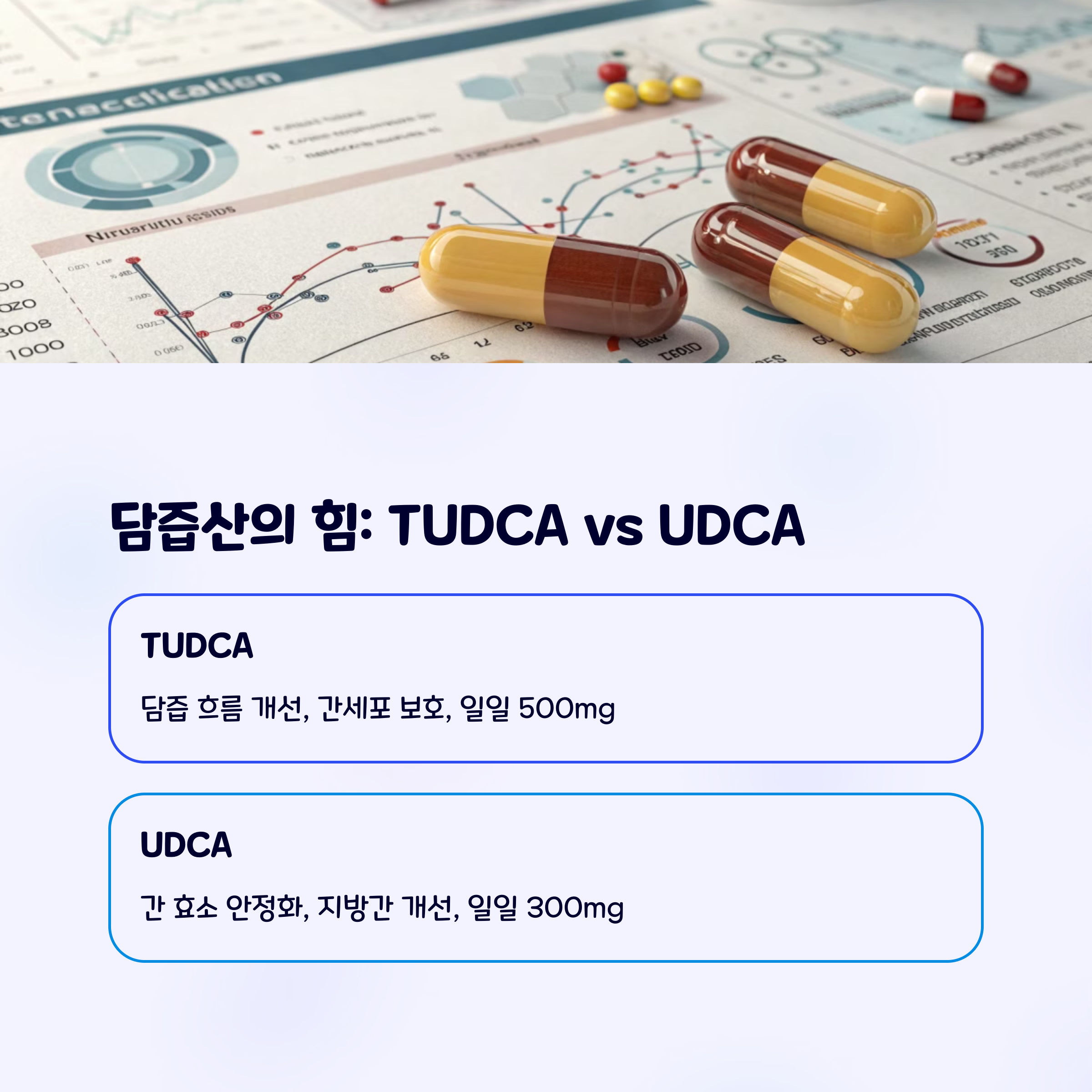 지방간이나 간 효소 수치가 높다면 TUDCA, 담도 관련 질환이나 알코올성 간염이 있다면 UDCA가 더 적합합니다.