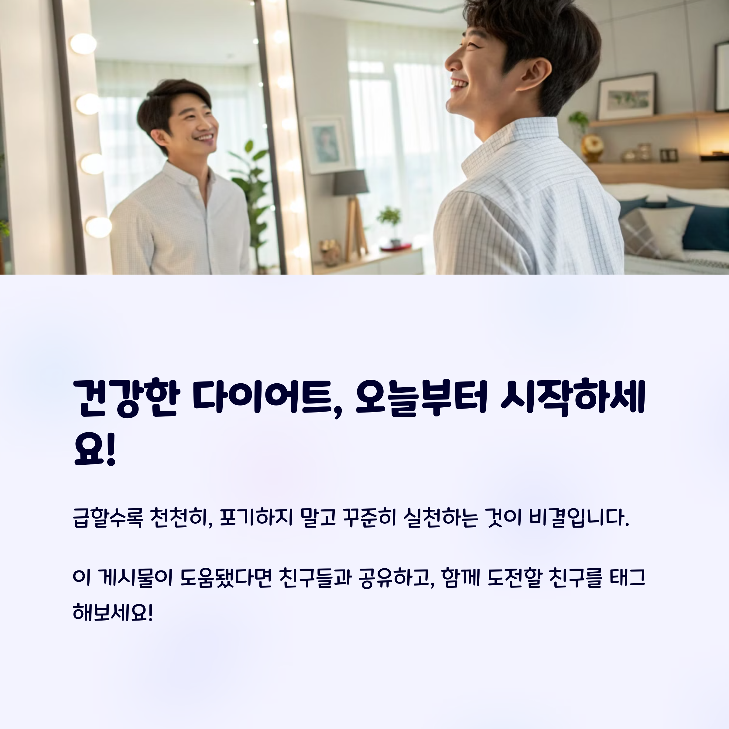 다이어트는 더 이상 괴로운 전쟁이 아니에요. 오늘 알려드린 건강하고 지속 가능한 방법을 바탕으로, 무리 없이 여러분의 몸과 마음 모두를 지켜가며 체중을 줄여보세요. 매일 조금씩 나아가는 걸음이 결국은 큰 변화를 만들어냅니다. 저도 여러분과 함께 꾸준히 실천해보려 해요. 혹시 도중에 지치거나 헷갈릴 때, 다시 이 글을 찾아오셔도 좋습니다. 우리, 건강하게 예뻐져봐요!