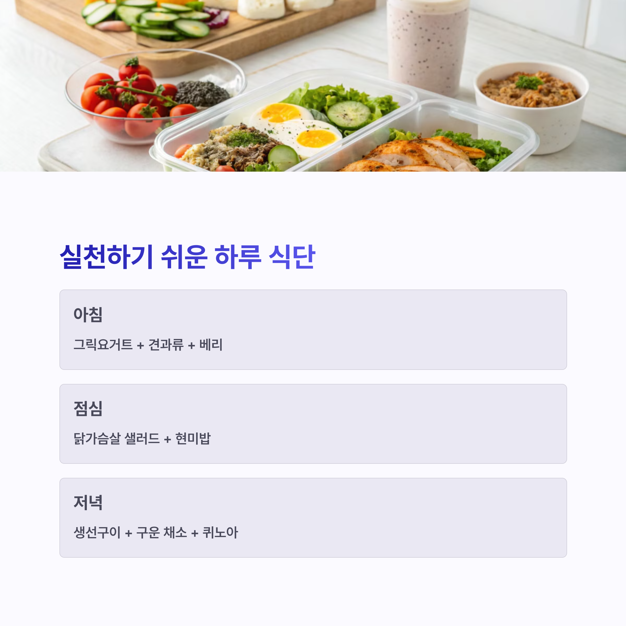 이 식단의 핵심은 단백질 균형, 자연식 위주 구성, 건강한 간식이에요. 간단해 보이지만 꾸준히 실천하면 진짜 몸이 달라집니다. 가능하면 주말에 미리 재료 손질해두는 것도 추천해요.