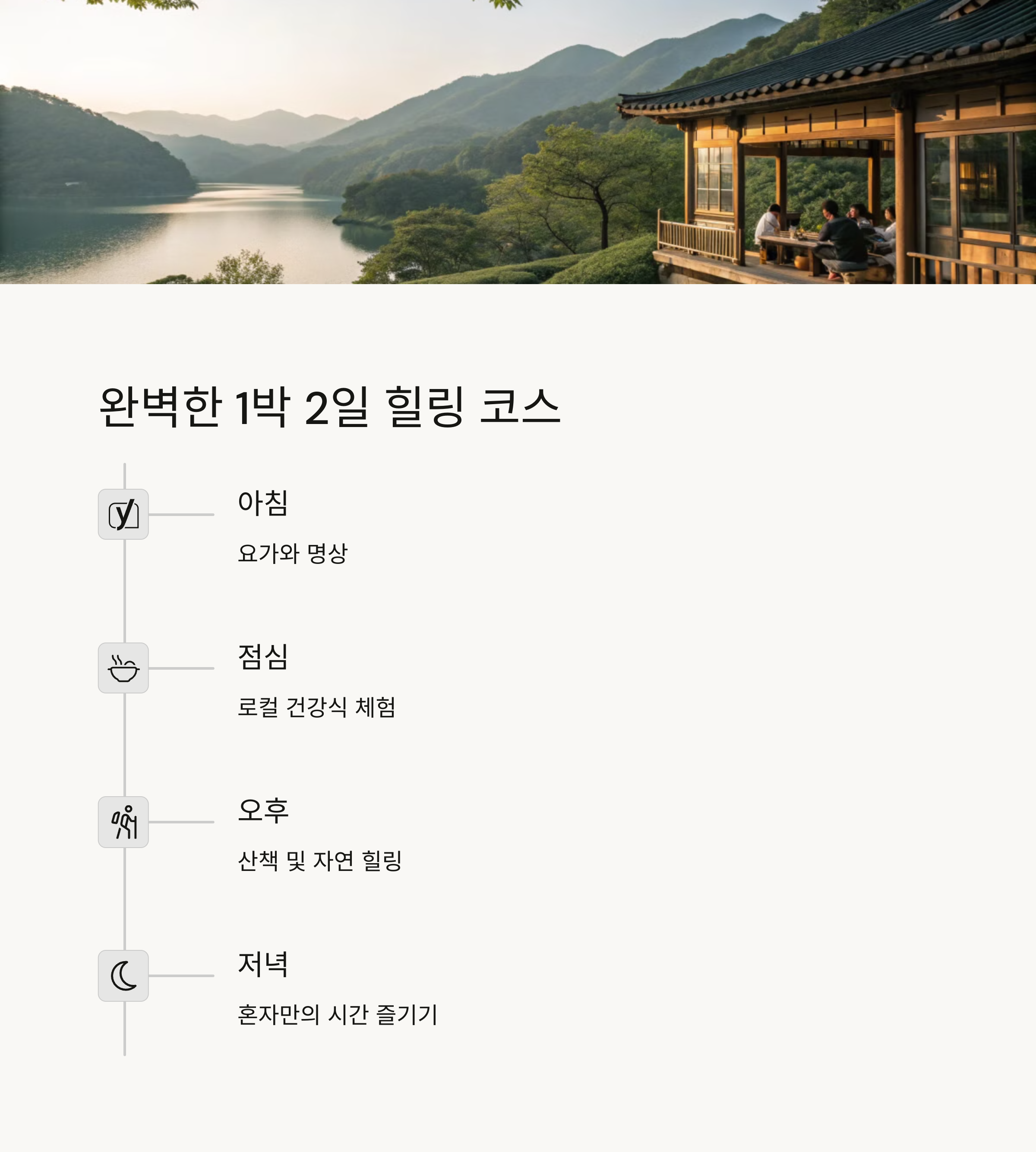 - 1일차: 도착 → 산책 코스 걷기 → 조용한 북카페 or 찻집 → 조식 제공 숙소 체크인