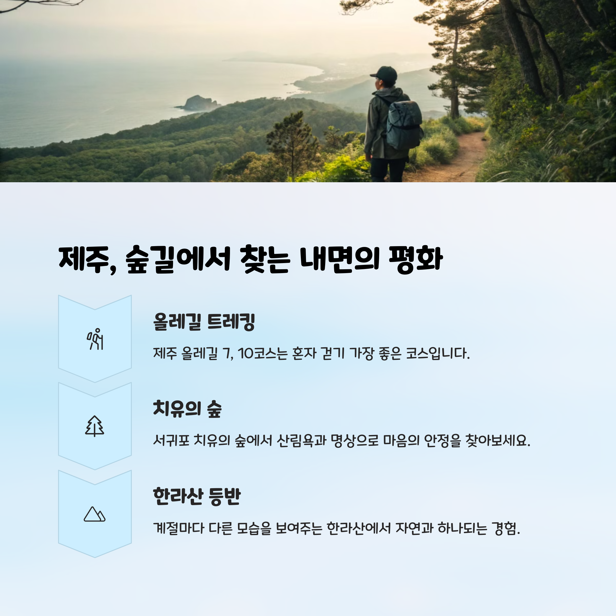 제주는 말이 필요 없어. 특히 비자림, 사려니숲길 같은 숲길 트래킹 코스는 혼자 걷기에 너무 좋아. 조용한 숙소에서 책 한 권 읽고, 혼밥하기 좋은 감성 식당도 많아서 1인 여행자 천국이야.