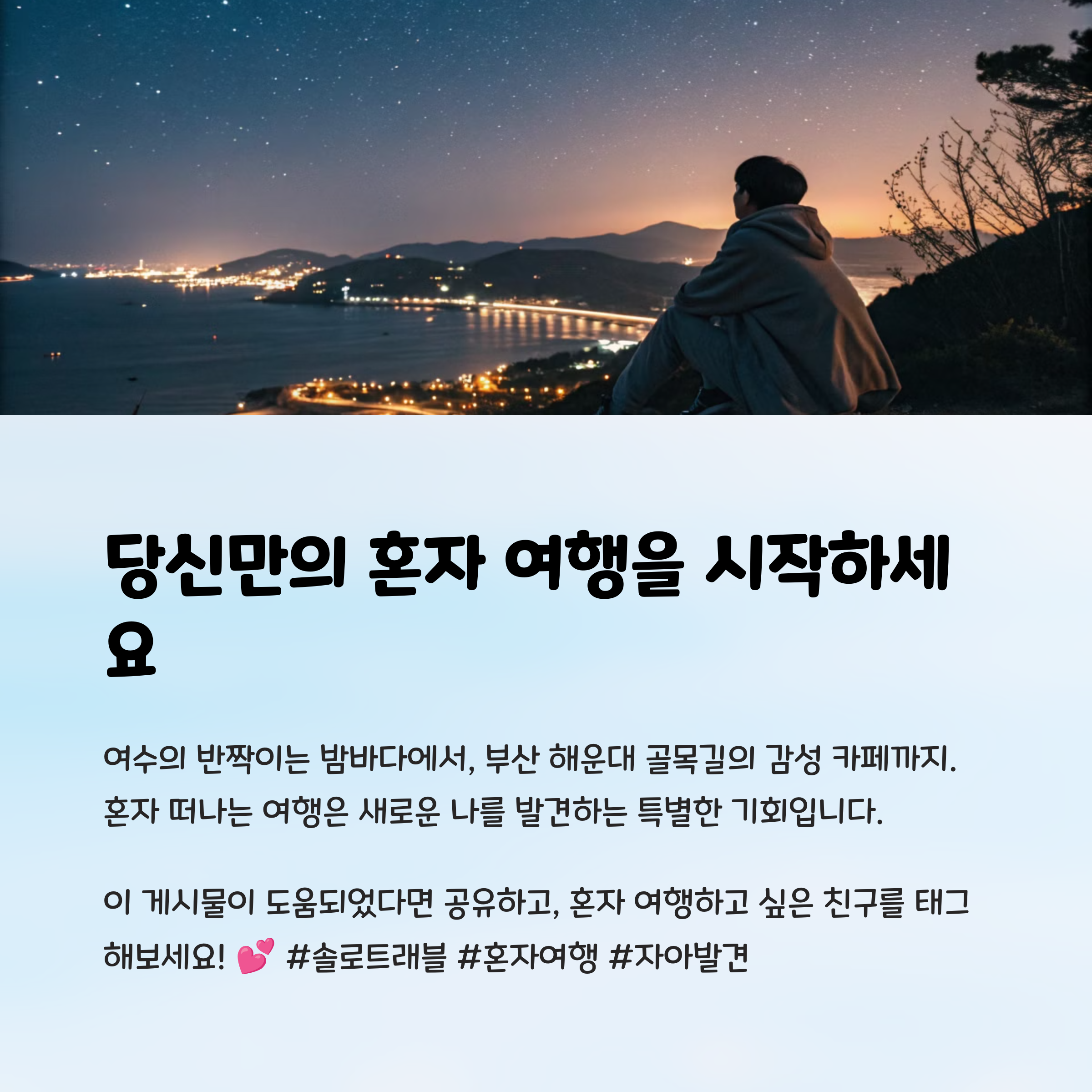 혼자여행, 국내여행추천, 혼자떠나기좋은곳, 힐링여행지, 여수밤바다, 전주한옥마을, 강릉카페거리, 제주비자림, 통영골목여행, 안동하회마을