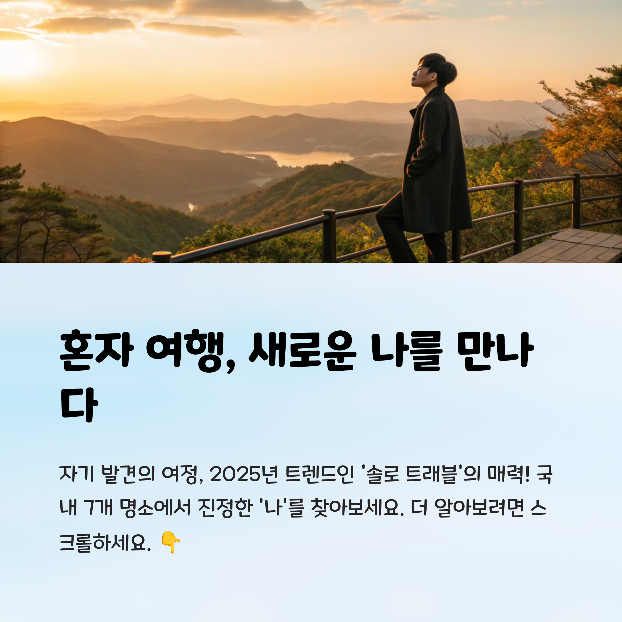주변에서 혼자 여행 간다고 하면 아직도 놀라는 사람들 있어. 근데 요즘은 혼자 여행이야말로 진짜 힐링이고, 자유롭게 나를 돌볼 수 있는 최고의 방식이더라. 나도 처음엔 혼자 버스 타고 떠나보는 게 어색했는데, 점점 그 고요함과 편안함에 빠져들었어. 그래서 오늘은 내가 가봤거나, 리스트업만 해두고 기회만 엿보는 ‘혼자 떠나기 딱 좋은’ 국내 여행지 7곳을 정리해봤어. 조용히 나를 위한 시간을 보내고 싶은 친구들에게 강추하는 코스니까, 마음 가는 곳이 있다면 이번 주말 바로 떠나보자!